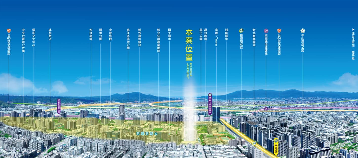 交通樞紐 回家快速-環狀線[幸福站](連結10條捷運線)、[新北產業園區](機場捷運與環狀線雙捷交會站)、64、65、台一線快速道路、中山、五楊、汐五高速公路系統匯集。
