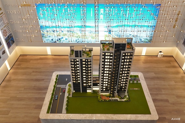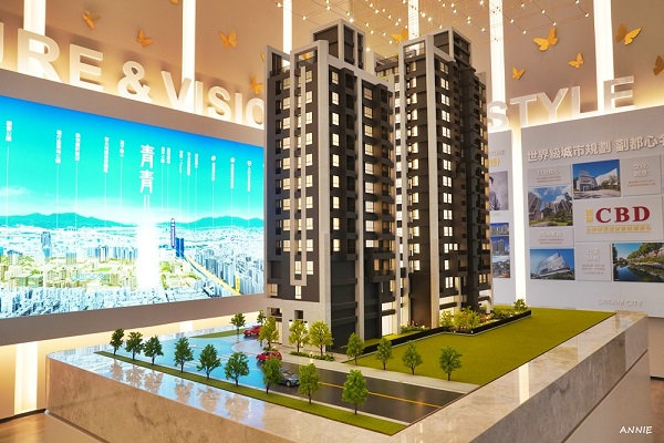 『青青-副都心名邸特區』接待中心一樓大廳規畫了非常寬敞的接待大廳,以及建案的模型造景,入內賞屋會有專人接待解說,目前呈現兩間樣品屋,為[23坪3房雙陽台一衛浴],與[30坪3房一陽台雙衛浴],透過樣品屋的呈現,可以一窺整體房子的概況。