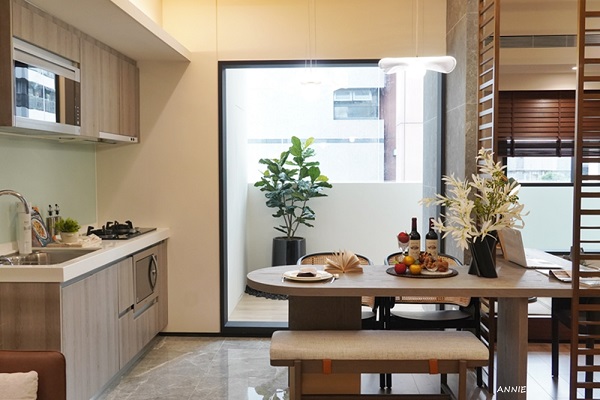 半開放式的廚房搭配餐桌,更可以凝聚家人的情感,一邊做飯一邊與家人互動,這樣的設計我覺得相當溫馨呢。