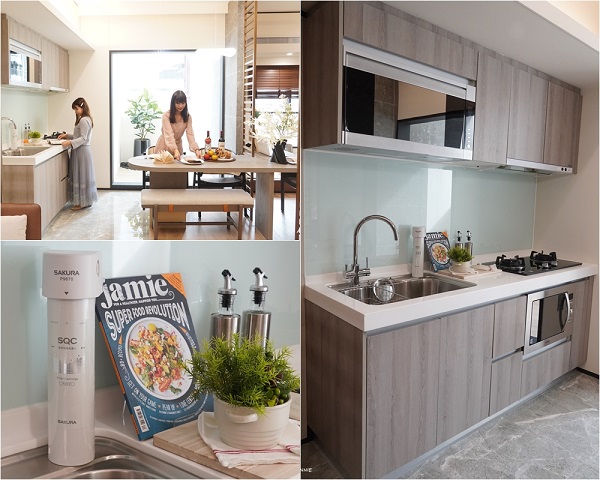 廚房的設備也是不馬虎,「SQC淨水器」、「「svago微烤爐」、「SAKURA廚具設備」,櫥櫃亦有上下層的收納空間,另外也配置了[烘碗機],貼心設置基礎的家電用品,寬敞的櫥櫃空間讓收納各式餐具餐盤更為得心應手。