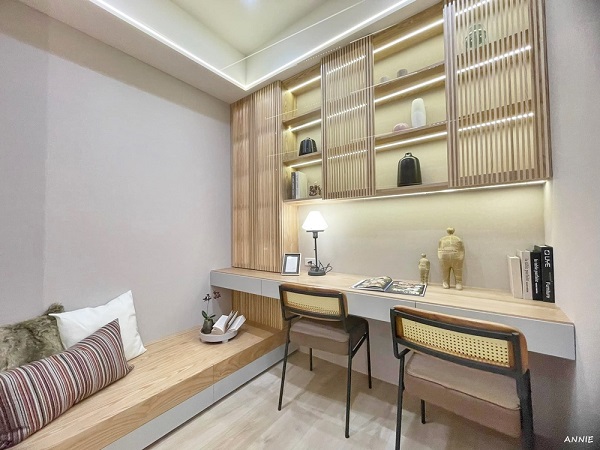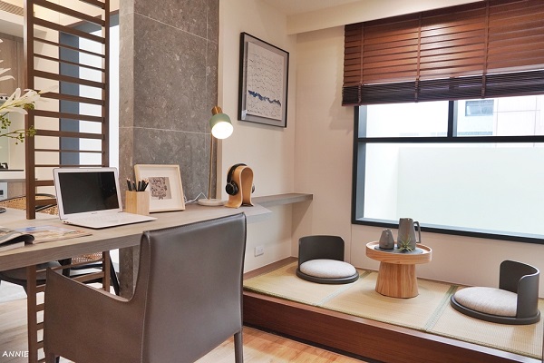 客廳旁邊設計了一間書房,角落搭蓋了木製休憩區,這裡可以當作是遊戲空間,也很適合作為客人臨時休息的地方,家裡有書房對於就讀的學生或是soho族便利許多,像我的家就有一間大書房,睡覺與工作的空間分開,工作上也較為有效率。