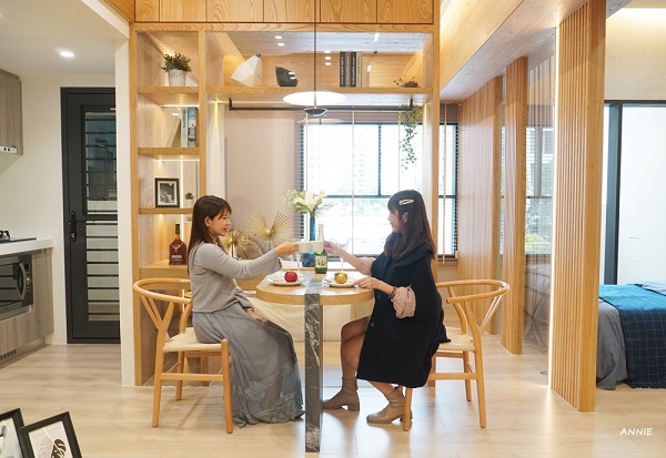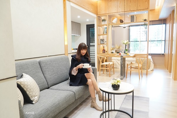 30坪3房的空間很適合小家庭入住,一走進客廳,即可以望向開放式的廚房,最讓人喜歡的是還有大陽台,裝設透明落地窗立刻延伸空間感,不得不說有陽台太重要了啦!選房子的條件我也會以[有沒有陽台]來當作我的考量,陽台可以擺放洗衣機,掛晾衣服,種植盆栽,而且白天時還可以迎進自然光,讓家裡更有明亮感,透光性好,整個家裡的溫度也更為溫馨。